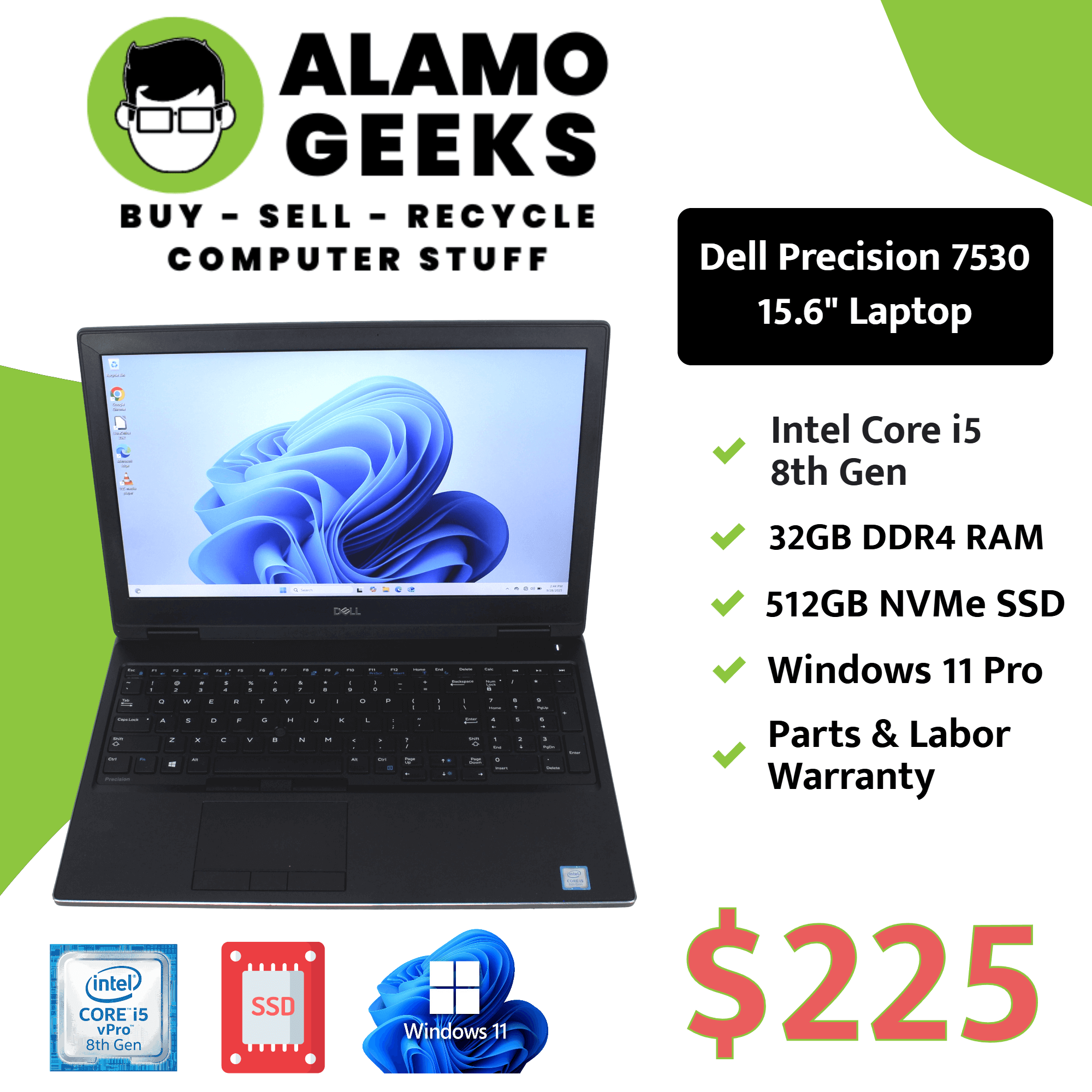 Dell Precision 15.6″ Laptop – Intel Core i5 8th Gen | 32GB | 512GB NVMe SSD | WIN 11 PRO