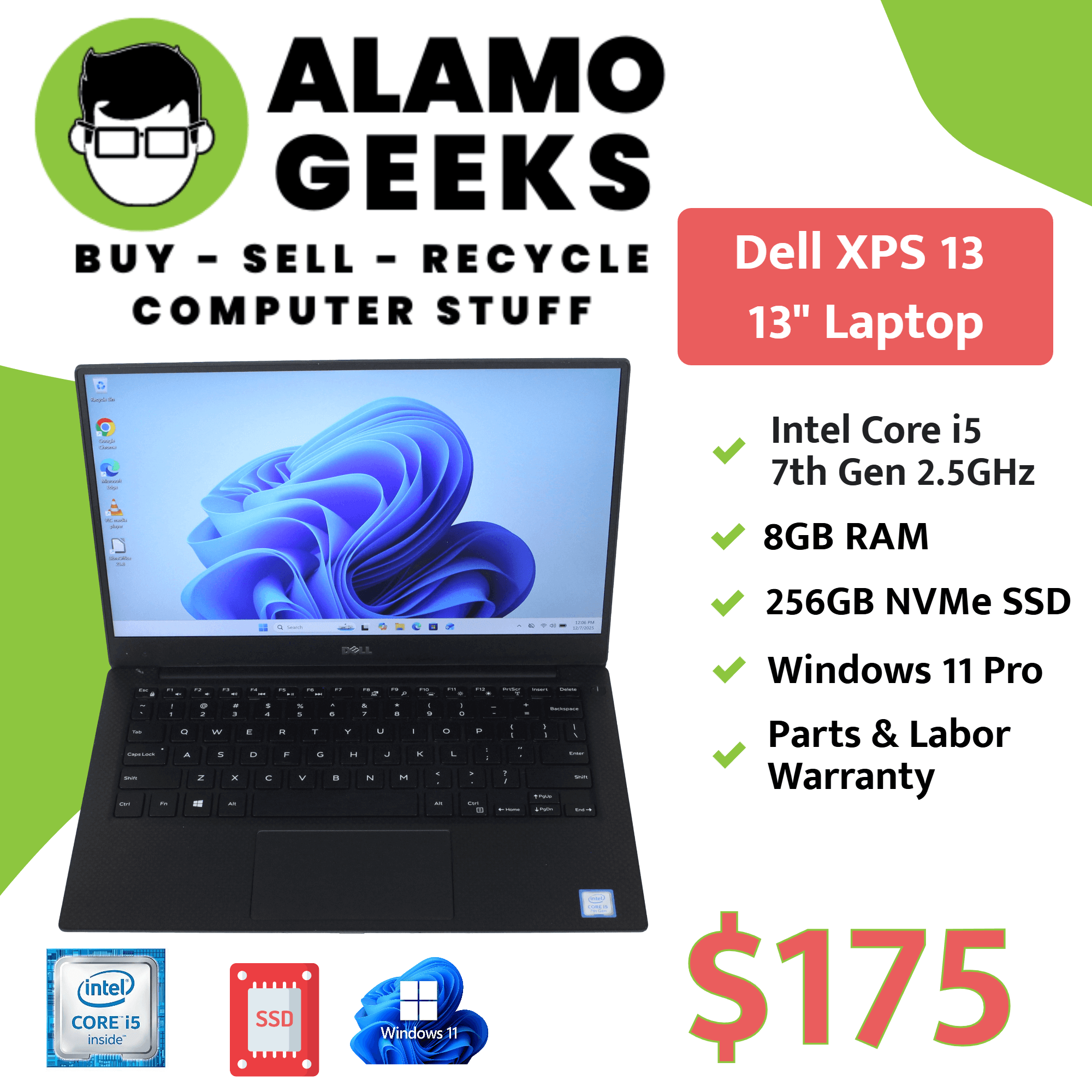 Dell XPS 13 Laptop – Intel Core i5 7th Gen 2.5GHz | 8GB | 256GB NVMe SSD | WIN 11
