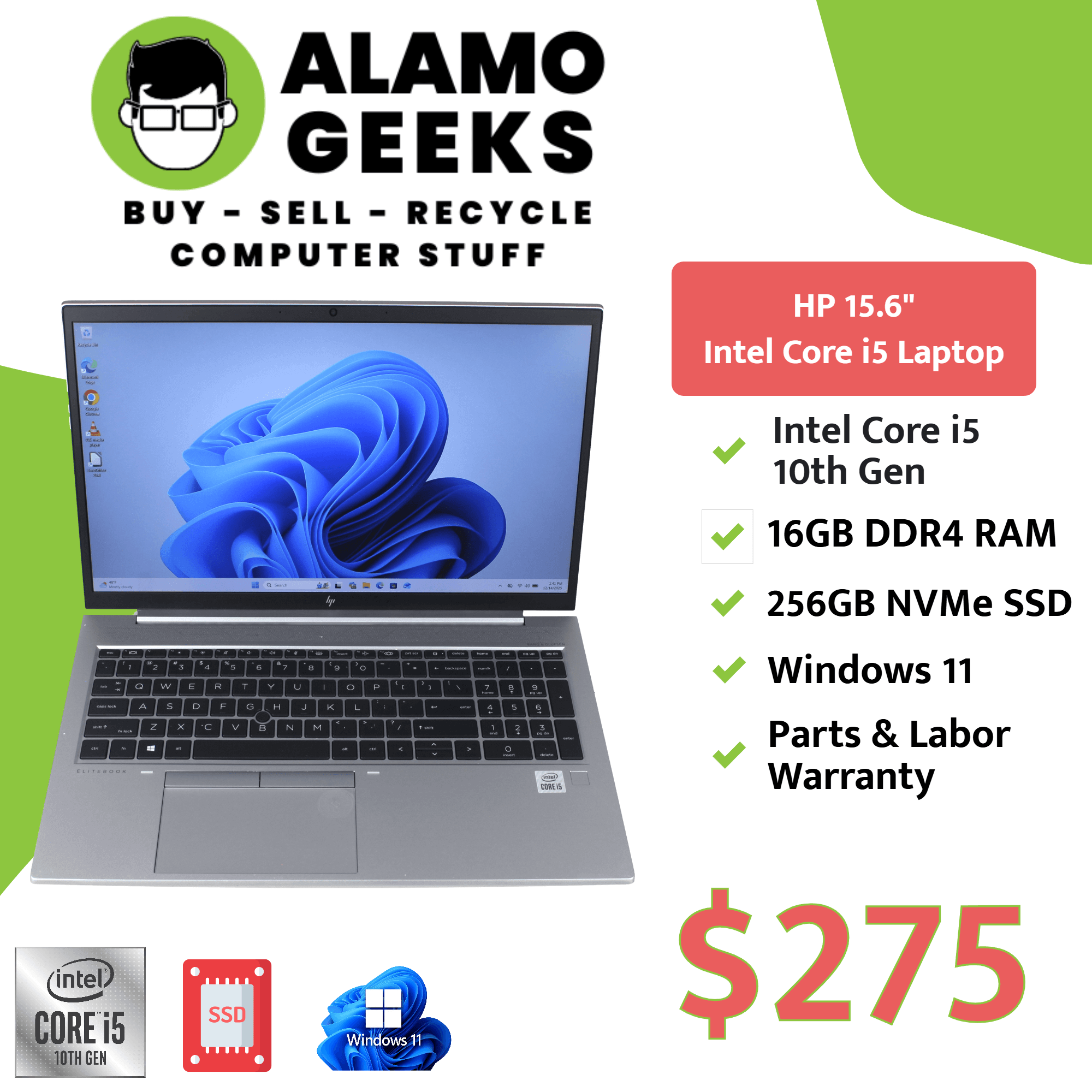 A HP EliteBook 850 G7 laptop is up for sale, ready to handle your home or business computing needs.  The laptop has been thoroughly tested by our experienced A+ Certified Technicians and includes a GENUINE installation of Windows 11 Professional.  In addition, a factory restore partition and a license are included if you need to reinstall Windows 11.  We also have Microsoft Windows Defender Antivirus and LibreOffice, a free alternative to Microsoft Office.